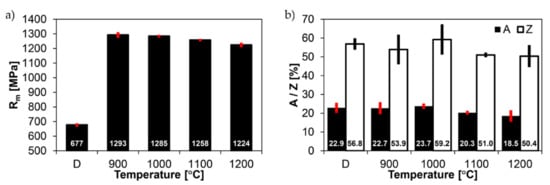 - The thermal treatment of the welded joint of Hardox 450 steel, consisting of normalising at 900 °C and hardening from temperatures in the range of 900–1200 °C, resulted in a significant increase in the strength (Rm) and ductility (A and Z) indices of the tested material, with only slight differences between them being a function of the increased austenitising temperature (Figure 20). The annealing of the welded joint before hardening in the range 900–1200 °C allowed obtaining the mechanical parameters within the following ranges (respectively to temperature): Rm = 1293–1224 MPa (Figure 20a), A = 22.9–18.5% and Z = 56.8–50.4% (Figure 20b).