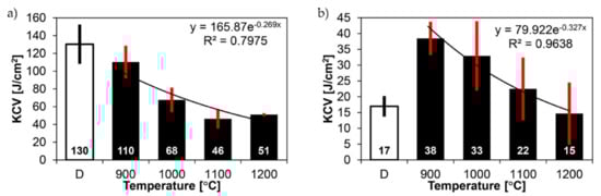 - The conducted investigations showed that for the impact test carried out at +20 °C, austenitising in the temperature range 900–1200 °C allowed obtaining the impact strength in the range of KCV+20 = 110–51 J/cm2, respectively. The influence of an increased austenitisation temperature on the impact toughness characteristics of the considered welded joint was also recorded at a reduced test temperature. In the above-described range of annealing temperatures before hardening, the obtained range of impact strength ranged from KCV−40 = 38–15 J/cm2, respectively. In this case, the brittleness point is definitely noticeable already at the austenitising temperature of 1000 °C.