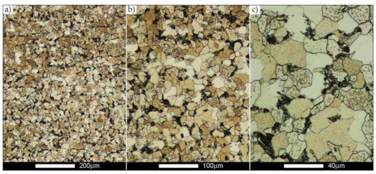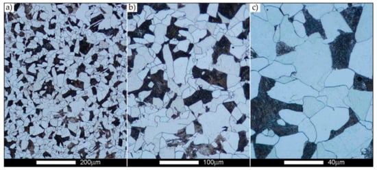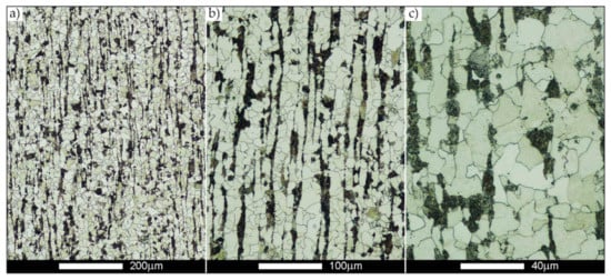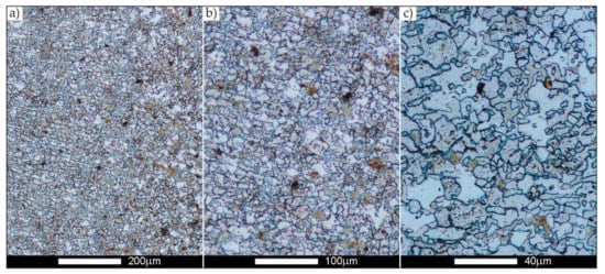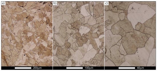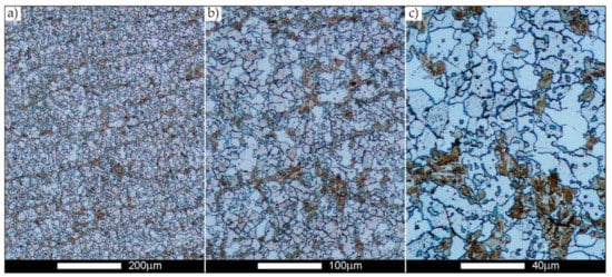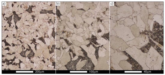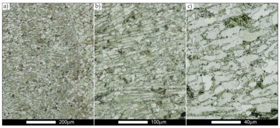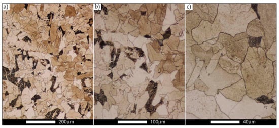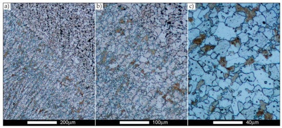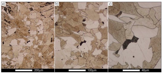 Welded joint microstructure of Hardox 450 steel in the normalised state with visible prior austenite grain boundaries—FL zone shown in Figure 2. (a) 100×; (b) 200×; (c) 500×.