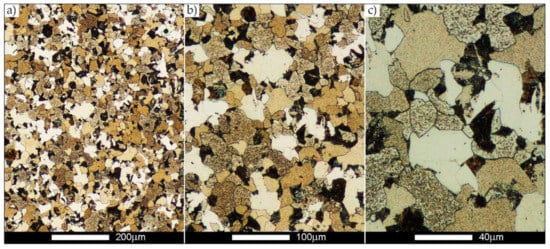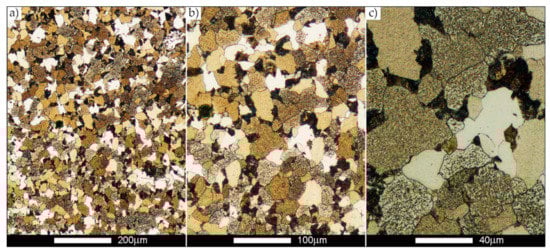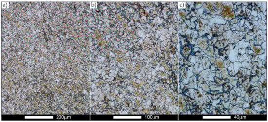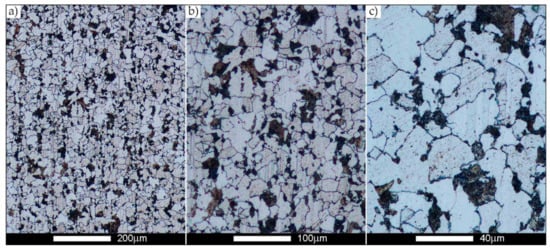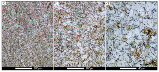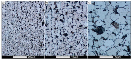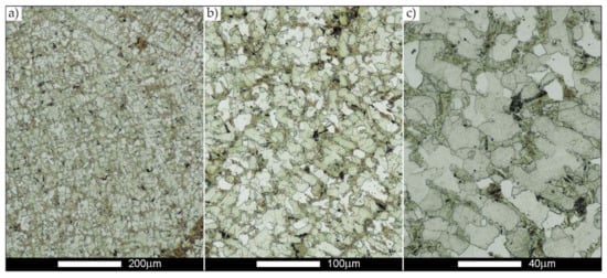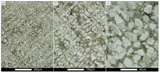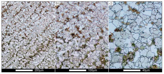 Welded joint microstructure of Hardox 450 steel in normalised state with visible prior austenite grain boundaries—WM3 zone shown in Figure 2. (a) 100×; (b) 200×; (c) 500×.