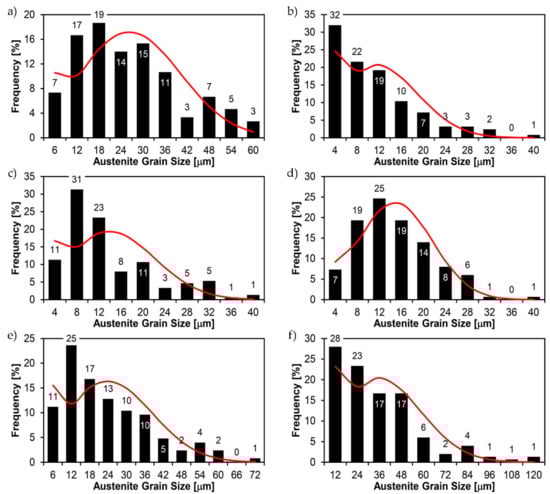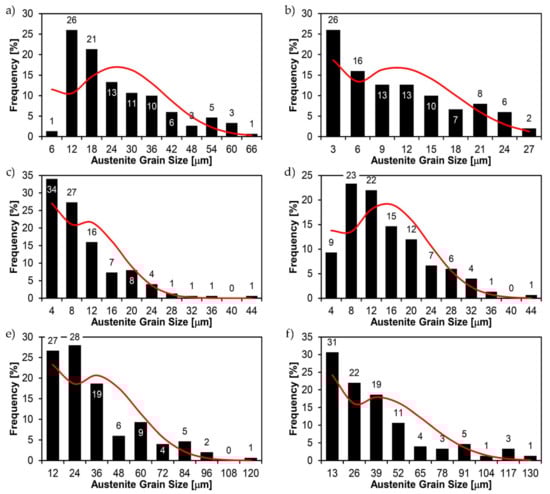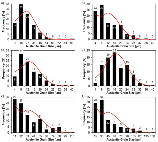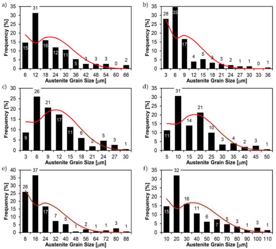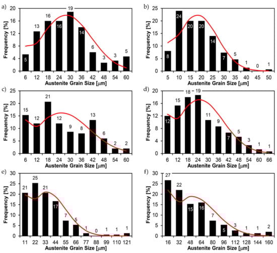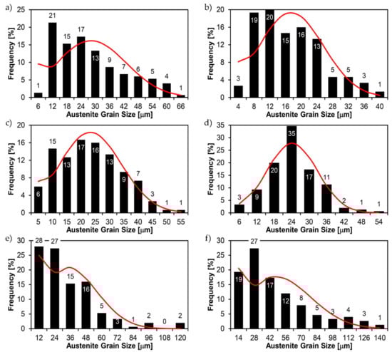 Frequency intervals and normal occurrence distributions of determined grain sizes of prior austenite in the welded joint zone of Hardox 450 steel marked as FL in Figure 2: (a) normalised state; (b) delivery state (directly after welding); (c) after austenitising at 900 °C for 60 min; (d) after austenitising at 1000 °C for 60 min; (e) after austenitising at 1100 °C for 120 min; (f) after austenitising at 1200 °C for 120 min.