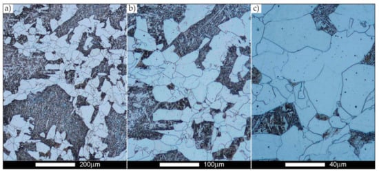 Welded joint microstructure of Hardox 450 steel with visible prior austenite grain boundaries, austenitised at 1100 °C—HAZ zone. (a) 100×; (b) 200×; (c) 500×.