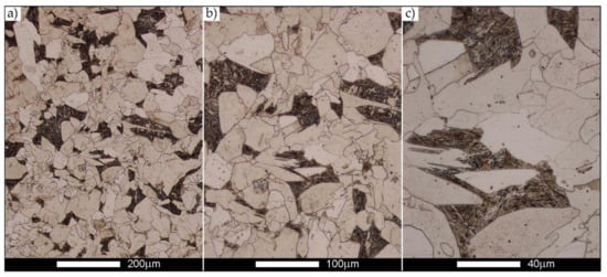 Welded joint microstructure of Hardox 450 steel with visible prior austenite grain boundaries, austenitised at 1200 °C—HAZ zone. (a) 100×; (b) 200×; (c) 500×.