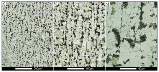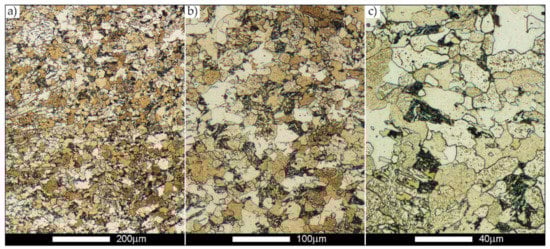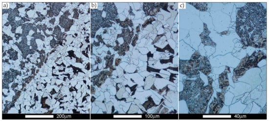 Welded joint microstructure of Hardox 450 steel in the normalised state with visible prior austenite grain boundaries—HAZ zone. (a) 100×; (b) 200×; (c) 500×.