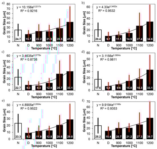 Juxtaposition of prior austenite average grain sizes as a function of temperature for individual weld zones of Hardox 450 steel shown in Figure 2: (a) parent material zone—BM; (b) weld metal zone—WM1; (c) weld metal zone—WM2; (d) weld metal zone—WM3; (e) fusion line—FL; (f) heat-affected zone—FGH(HAZ); N—normalised state, D—delivery state (directly after welding).