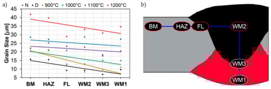 Figure 65a presents changes in the average grain size as a function of the analysed zones, running along the line shown in Figure 65b. The trend line shows a steady decrease in the average grain size starting respectively from the zones of the native material and the heat-affected zone, the fusion line, and the weld metal WM2, WM3, and WM1. This shows a clear difference between the grain growth pattern in the parent and weld metal, which is characterised by a smaller average grain size and a higher point of rapid grain growth. Thus, the selection of an appropriate heat treatment for welded joints of martensitic boron alloyed steels should take into account the aforementioned differences and ensure a gradual transition from the smaller grain size in the weld metal, across the fusion line, the heat-affected zone, to the parent metal.