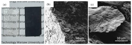 Standard characterization was conducted to assure the quality of the fabricated material. Figure 1a shows a picture of PLA/GNP composite and a pure PLA reference sample. The opacity change in the GNP-loaded composite is visible. SEM pictures were taken using Raith E-line+ (Dortmund, Germany) to check the homogeneity of the dispersion of graphene flakes in a polymer matrix. Figure 1b,c show SEM pictures of a PLA/GNP composite infused with 25 μm GNP at 15 wt% loading. The SEM pictures show the distribution of the GNP in the polymer matrix and provide a rough estimate of GNP lateral size. They confirm the random flake distribution and consistency of GNP size with the datasheet given by the GNP provider.