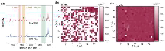 (a) Typical Raman spectra of a pure PLA sample and PLA/GNP composite with GNP characteristic bands highlighted. Raman maps showing G band position of (b) a sample with 0.5 wt% GNP and (c) a sample with 15 wt% GNP.