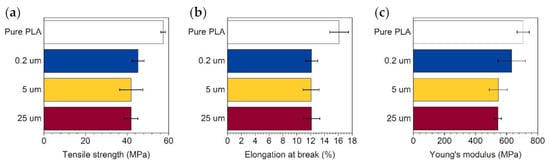 Tensile strength tests were conducted by the Instron 5566 Universal Testing Machine (Norwood, MN, USA), equipped with a 10 kN measuring head and self-tightening roller tensile grips. Tensile strength tests were performed at room temperature at a running rate of 20 mm/min. Test species in the shape of “dog bone” comprising 10 wt% of graphene in the mixture with PLA were used. Data were processed with BlueHill2 software (Instron, Norwood, MN, USA). The obtained results for composites containing GNP of various flake sizes: 0.2, 5, and 25 μm are shown in Figure 3. The introduction of 10 wt% of any GNP to neat PLA causes a decrease in tensile strength and maximum elongation and an increase in material stiffness. However, the tensile strength of obtained composites is higher than for neat aliphatic polyolefins, e.g., HDPE [23,24,25].