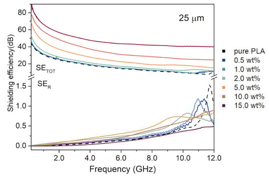 EMI shielding efficiency and its components are commonly used quantities to describe materials for potential shielding applications. By calculating the shielding efficiency and the analysis of the contribution of its reflection and absorption components, it is possible to distinguish the main EMI shielding mechanism. Figure 4 shows typical SETOT and SER of PLA/GNP composites with GNP of 25 μm lateral size in function of frequency in the microwave range from 0.2 to 12 GHz (see Figure S4 for analogical graphs for composites with GNP of 0.2 and 5 μm lateral size). The spectra should be analyzed with respect to the reference sample—pure PLA marked with a black dashed line in the graph. SETOT shows an explicit dependency on the nanocarbon filler loading in the composite. The higher the GNP loading, the stronger the shielding properties. SETOT shows no clear dependence on the frequency, except for the reference sample and low GNP loading samples (under 5 wt%), which show a shielding growth at frequencies close to 12 GHz. That growth is reproduced in the reflection component at similar frequencies. Contrary to SETOT, SER does not show dependency on the GNP content, except for the peak close to 12 GHz. Instead, the SER values of PLA/GNP composites are comparable to those of pure PLA.