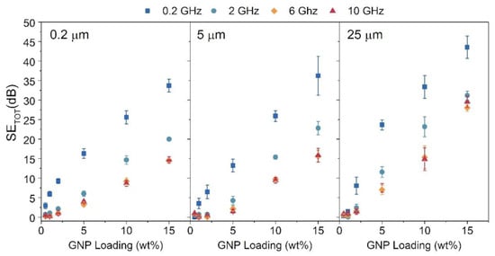 Total shielding efficiency of PLA/GNP composites at three different frequencies. Each panel shows data for different graphene flake size. Data is plotted in relation to GNP loading.