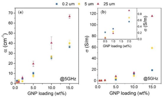 The influence of nanofiller geometry is also visible in the absorption coefficient shown in Figure 6a. The absorption coefficient is an important quality, especially in materials whose main shielding mechanism is absorption. The absorption coefficient is measured as , where d is the thickness of a sample and Abs is the absorbance of the material, which is calculated as . As seen in Figure 6a, the absorption coefficient changes linearly with the GNP loading, similar to the SETOT. Like shielding efficiency, α depends on the size of GNP dispersed in the composite. The highest α is exhibited in composites with a GNP size of 25 μm and equals 67 cm−1 for a sample with 15 wt% GNP loading (measured at 5 GHz).
