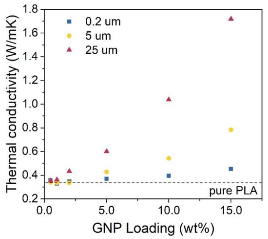 A similar study has been conducted by Kargar et al., which reported on EMI shielding efficiency and thermal conductivity of epoxy composites imbued with GNP of two different thicknesses—up to 3 and 12 nm [3]. Here we show that not only the thickness but also lateral size of a GNP is of utter importance to the potential heat management of material. Thermal conductivity measured for a PLA/GNP composite with 15 w% of 25 μm GNP is consistent with the values for epoxy/GNP composite reported by Kargar et al. [3], however, it is much higher than similar PLA based composite reported by Spinelli et al. [26]. Thermal conductivity shows exponential growth with GNP loading, similar to electrical conductivity. We assume this relation shows the common origin of electrical and thermal conductivity in polymer composites infused with conductive nanofillers, which we have previously stated as the formation of conductive paths. The relation between nanofiller loading and thermal conductivity in highly loaded composites has been investigated by Kargar et al. [16], showing similar results.