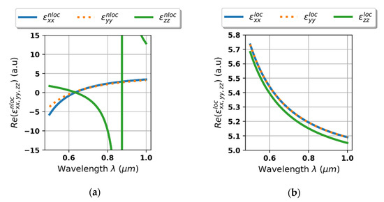 Firstly, to determine the influence of non-locality, we consider spectral characteristics of effective permittivity tensor components of the HMM structure acquired with the help of non-local and local effective medium approach, see Figure 3a,b, respectively. Due to the strong non-locality, the HMM structure reveals Type II hyperbolic dispersion and a strong resonant transition, which cannot be predicted with the help of local EMT approximation [28], compare Figure 3a,b.