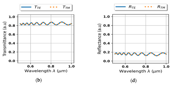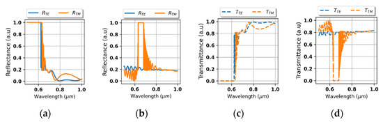 Further analysis is focused on transmittance and reflectance of the considered system shown in the Figure 2. As we can see in the Figure 4a,b, the proposed device reveals strong rejection, i.e., no transmission, for light of arbitrary polarization for wavelengths shorter than approximately 0.625 μm. It is noteworthy that the transition between rejection and transmission range is accompanied with side lobes of oscillatory character, which is typical for edge and band optical filters [39]. Again, it is worth noting that this behavior cannot be predicted within the scope of local approximation, compare Figure 4a–d.