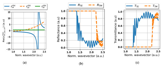 Effective permittivity tensor components (a), reflectance (b) and transmittance for TE and TM polarization (c) of the considered structure plotted vs. wavevector magnitude normalized to the wavevector of free-space wavelength λ = 600 nm at fixed angle of incidence θinc = 0° (air-side incidence).