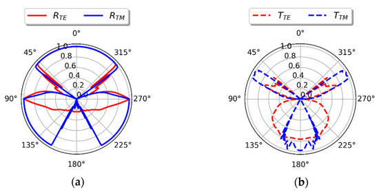 To fully explore the sustainability of optical isolation over a wide range of angles, we have investigated 360°-angle radial characteristics of reflectance and transmittance for a wavelength arbitrarily chosen from the operating spectral range λ0 = 600 nm, see Figure 8a,b, where angles θinc∊ (270°,90°) correspond to incidence from the air side while θinc∊ (90°, 270°) are related to the substrate side incidence. It can be observed that the radiation of any polarization impinging from the air side is transmitted only within a narrow range of incidence angles, while waves incoming from the substrate side at an almost arbitrary angle of incidence are transported through the structure, see Figure 8a,b. Thus, the behavior of a “true” optical isolator is sustained within a wide-angle range. As indicated earlier, the structure may also serve as a TE polarizer for waves impinging from the substrate side at larger angles.