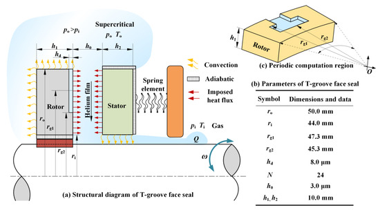 The thermal boundary condition between the gas film and the sealing surfaces is imposed heat flux, and the thermal boundary conditions between the sealing rings and the surrounding environment are convection and adiabatic. The T-groove is distributed periodically along the surface of the moving ring in the circumferential direction. As shown in Figure 1c, for the sake of simplifying the numerical solution process, a single T-groove is taken as the research object in the numerical calculation.