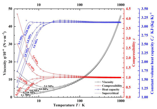 where ε is the compressibility coefficient of the gas, id is the degrees of freedom of motion of gas molecules, cp is the pressure constant coefficient (cp = R/cv), R is the ideal gas constant, Em is the energy of gas molecular per freedom. Here, the database REFPROP published by NIST is used to obtain the helium properties, and the properties are shown in Figure 2 [33].