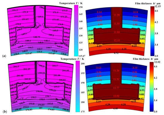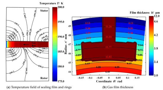 Further, temperature fields and film thickness distribution of the sealing film under different ambient temperatures are illustrated in Figure 4. Obviously, the gas film temperature drops about 3.0 K at the outer diameter, although the film temperature rises along the circular direction due to the velocity shear. With the rise of sealing ambient temperature from 150 K to 300 K, the gas film temperature difference drops from 30 K to 3 K. The reason is that with the rise of the sealing medium temperature, the compressibility of the sealing medium is reduced, then the heat absorbed by gas expansion decreases. More important is that, according to Figure 4, the film temperature drop leads to divergent face distortion. When the sealing ambient temperature is reduced by 150 K, the outlet gas film thickness increases by 0.5 μm. The reason is that the temperature difference between the outlet and inlet diameters is reduced, which makes the thermal deformation diminish. Simultaneously, it means there is a higher risk of dropping of the opening performance and contact wear failure [5,32].