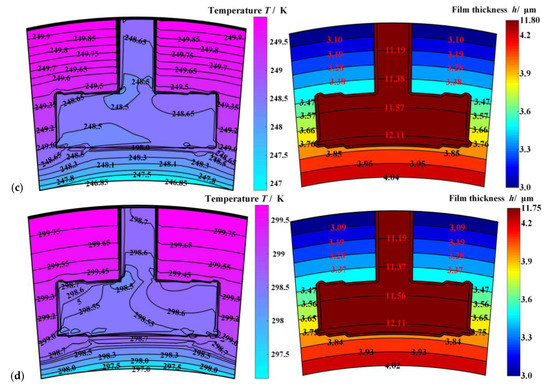 The film temperature fields and film thickness distribution of the sealing film under different inlet ambient temperatures (h0 = 3.0 μm, ω = 20,000 r·min−1, po = 5.0 MPa,). Note: (a) To = 150 K; (b) To = 200 K; (c) To = 250 K; (d) To = 300 K.