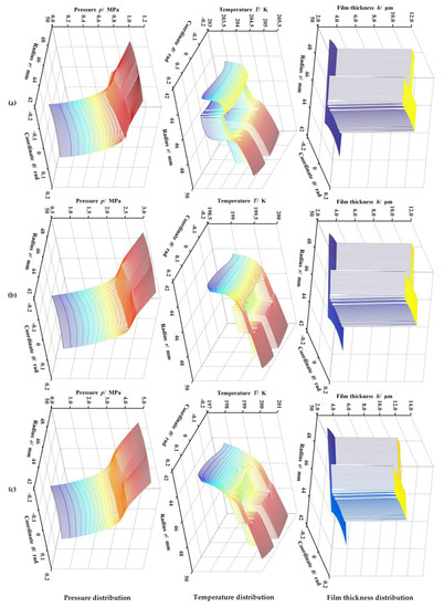 Variation of the pressure, temperature, and film thickness distribution of helium gas face seal with different inlet ambient pressure (h0 = 3.0 μm, ω = 20,000 r·min−1, To = 200 K). Note: (a) po = 1.0 MPa; (b) po = 3.0 MPa; (c) po = 5.0 MPa.