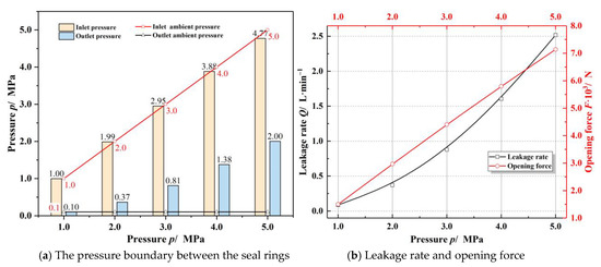 Figure 6 displays the influence of sealing pressure on sealing performance. As seen in Figure 6a, the inlet pressure loss and the choked flow effect are not apparent at low sealing pressure of 1.0 MPa, since the flow velocity of the gas at the outlet does not exceed the speed of sound. While the sealing ambient pressure is 5.0 MPa, the flow velocity of the gas at the outlet exceeds the speed of sound, the choked flow effect makes the outlet film pressure rise to about 2.0 MPa, much higher than the environmental pressure, while the inlet pressure loss is about 5%. The opening performance of the seal has a linear relationship with the inlet pressure. As a result, the opening force is enhanced about 5 times and the leakage rate increases nearly 29 times as the sealing ambient pressure rises from 1.0 to 5.0 MPa.