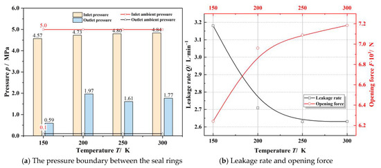 Figure 7 presents the effect of the sealing ambient temperature on the sealing performance. As seen in Figure 7a, the inlet pressure loss increases while the outlet pressure presents a complex trend, with the decrease of the sealing temperature. The reason for this phenomenon is that it is easier for the gas flow speed to reach the sound velocity at low temperatures, resulting in more significant pressure loss. However, at low temperatures, since the sealing clearance presents a divergent shape, the gas flow velocity at the outlet becomes lower, and the blocking effect is weakened. Meanwhile, as the sealing temperature drops from 300 K to 150 K, the leakage rate increases about 17% as well as the opening force decreasing about 15%. The decrease of opening performance will reduce the gas film thickness and increase the probability of contact wear failure [2].