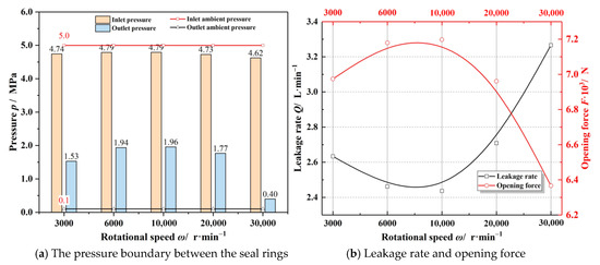 The influence of the speed of moving ring on sealing property is given in Figure 8. With the rising of rotational speed, both the outlet film pressure and the sealing performance present a non-monotonic trend. In the cases of low speed, the outlet pressure increases with increasing speed. When the speed is large enough, the outlet pressure begins to decrease with the increasing speed. Correspondingly, when the speed is relatively low, the opening performance increases and the leakage rate decreases with increasing speed. Once the speed becomes large enough, the opening force reduces while the leakage rate increases. Here, while the rotational speed of the rotating ring increases from 3000 to 30,000 r·min−1, the leakage rate changes by more than 30%, and the opening force is reduced by about 10%. The numerical results of sealing performance are in accordance with the experimental results of Zhang et al. [30,31]. The experimental results show that the leakage rate fluctuates in a certain range with the increasing rotational speed, and the overall trend is increasing.