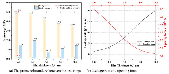 Figure 9 illustrates the influence of the basic film thickness on sealing performance. As seen in Figure 9a, the high-speed airflow effect makes the gas film pressure boundary change significantly with rising basic film thickness, the inlet boundary pressure decreases rapidly, and the outlet pressure increases quickly. As a whole, the sealing performance presents a monotonic trend with the increasing film thickness at low temperatures. That is to say, as the basic film thickness increases, the pressure at the outlet and the leakage rate raise while the opening force and the inlet pressure decrease. For the face seals with groove depth of 8.0 μm, when the film thickness increases to 10.0 μm, the inlet pressure may drop from 5 MPa to 3.5 MPa, the outlet pressure may increase to 1.43 MPa, and the opening force decreases by about 38%.