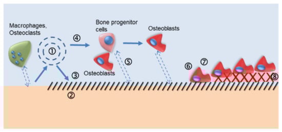 The mechanisms of the bond between a bioactive layer and the bone tissue are complicated as different interactions between the biomaterial and the bone are involved. The interactions occur at the atomic, molecular, and cellular levels. A schematic of the most important mechanisms that occur is shown in Figure 1 [23].