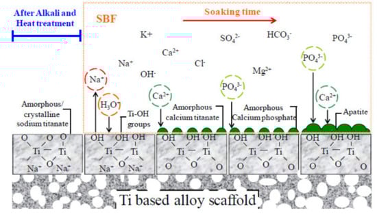 During heat treatment, this hydrogel is dehydrated and densified, forming a stable layer of sodium titanate, partially crystallized. When the thermo and chemically treated titanium is immersed in body fluid, the amorphous layer quickly releases Na+ ions, forming Ti–OH groups on the surface of the metal, which is enhanced as the amount of Na+ ions released increases. The formed Ti–OH groups, which are produced by the exchange of Na+, are initially combined with the calcium ions from the SBF, forming an amorphous calcium titanate (Figure 2).