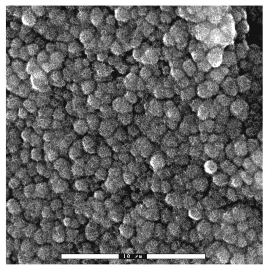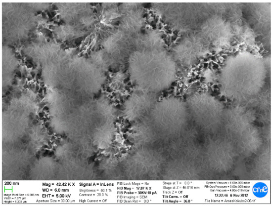 When sodium titanate is immersed in a solution simulating human plasma, it shows the appearance of apatite crystals [44,45,46]. This SEM observation is depicted in Figure 6.