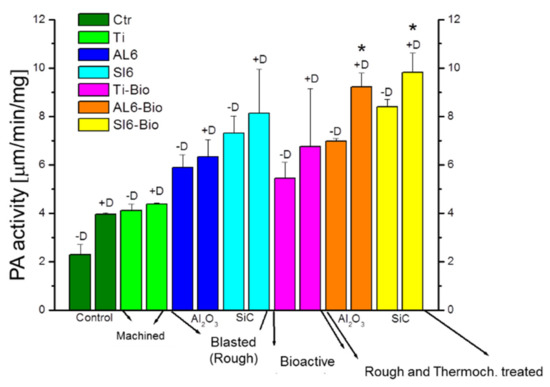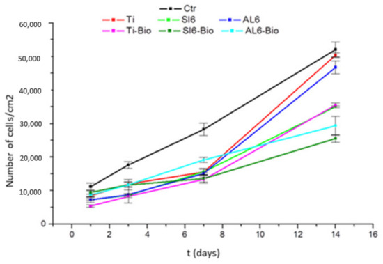 Ctr: control; Ti: titanium cp; Ti-Bio: smooth titanium with sodium titanate; Si6 sandblasting with SiC; Al6 sandblasting with Al2O3; and Al6-Bio: sandblasting with alumina and sodium titanate.
