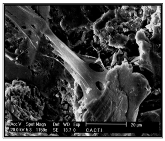 Osteoblastic cells that were on the metallic foams for 7 days are shown in Figure 15. The cell culture of human osteoblastic cells in microspheres have been be observed, with good behavior in cell extension and dorsal activity of the cells [71,72]. No preferential zones for their adhesion have been observed, nor any influence on the studied sizes of the spheres [71,72,73,74,75].