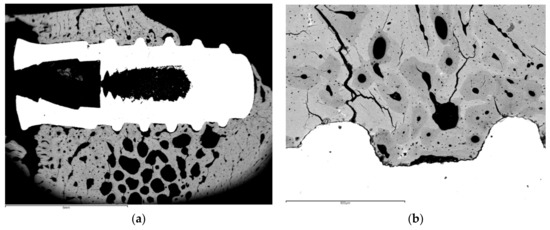 Klockner’s dental implantations were performed on pigs at different times of osseointegration. In Figure 11, the thermochemical treatment (2S) can be observed, showing that the sodium titanate had a good osseointegration at 4 weeks after implantation. This value is compared with other surface treatments (R: roughened by blasting; E: acid attack; Ctr: control). These values show an acceleration of bone in-growth around the dental implant, which was already significant 2 weeks after implant placement. These implants provided excellent primary fixation, even before the hard tissues started to significantly regenerate. These osseointegration levels evidenced the good short-term in vivo performance of the treated surfaces in comparison with the other conventional implants tested. Osseointegration was accelerated and, consequently, implant failure decreased. Figure 12 indicates the osteoconductive behavior of the thermochemically treated surface two2-step), where it can be observed that the new bone is growing from the surface of the implant [44,45,46].