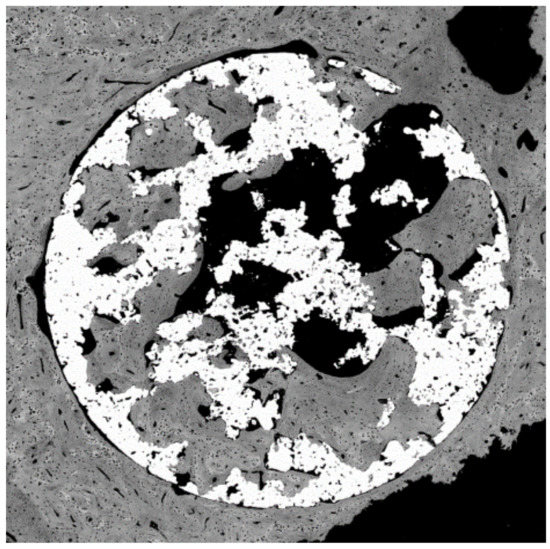 Since the spheres or porous materials obtained are composed of titanium, thermo-chemical treatments have been successfully carried out to obtain the sodium titanate layers that allow the formation of apatite in contact with the physiological medium, accelerating the mineralization process; therefore, the bone colonization will be faster. It was observed that the titanate layer obtained by the treatment is introduced in all the holes and channels of the implant; therefore, the material will have a high osteoconductive-specific surface for bone formation. This finding can be observed in Figure 16. Figure 17 shows a porous titanium material with thermo-chemical treatment in which the colonization and formation of new bone inside the pores of a dental implant can be observed.