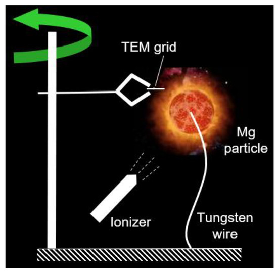 This experiments program was conducted as described in our previous work [8,9,10]. The approach is sketched in Figure 1. In brief, a magnesium cube with ~3-mm side with a blind hole with a 0.5-mm diameter was secured on a 0.25-mm diameter tungsten wire, and ignited by a portable propane–air diffusion flame that was immediately removed after the particle ignition. The typical burn time was on the order of 10 s. A tweezers-type support holding the transmission electron microscope (TEM) grid was attached to a vertical rod. The quick rod rotation around the vertical axis allowed for the very short residence time of the TEM grid within the zone of MgO nanoparticle generation. Some estimates indicated that the residence time of the grid in the generation zone was about 1 ms in all experiments [8].