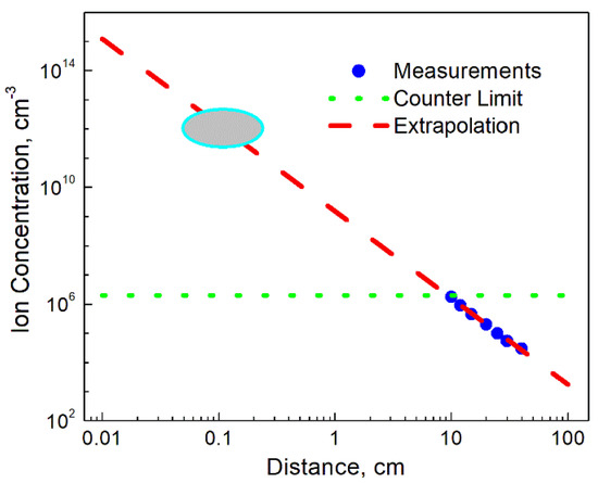 The ion concentration measurements were then undertaken by an Air Ion Counter (AlphaLab Inc., Salt Lake City, UT, USA), commonly used for similar investigations [20]. Similarly to the previously reported results, measurements undertaken in a close vicinity of the ion emitter exceeded the upper limit of the instrument (2 × 106 cm−3). This outcome was well expected for such powerful emitters, dictating a need for some extrapolation of the results obtained at more distant locations from the device. The results of measurements and corresponding analysis are shown in Figure 4. Obviously, taking into account a substantial increase in the ion concentration over very short distances, Figure 4 should rather be considered as a generalized illustration of the ionizer capabilities. As is seen, the upper detection limit of the instrument was reached at the distance of approximately 10 cm from the emitter. Then, the results gradually decreased over the following 30 cm, reaching low values comparable with the natural background. The extrapolation of the graph shows that the concentration of ions at the source can be potentially on the order of 1012 cm−3, i.e., be comparable with the estimated electron concentrations. Such findings enable one to draw the corresponding conclusion that the ion flux applied to the flame can significantly affect the charge distribution in the system, and, therefore, result in the particle temperature change. A detailed study of the charge distribution would be helpful, however, due to a limited process time, the existing technique such as that described in refs. [21,22] should be substantially modified.