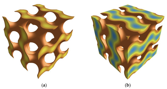 The TPMSs are intriguing due to their ability to exhibit unique physical properties. For example, such surfaces are used to model different crystalline structures in both natural and synthetic systems. Examples of these structures include LLCs and TLCs [18,19], block copolymer (BCP) self-assemblies [2,20,21,22] and organic zeolites [23]. It is noteworthy that one important structural difference between the LC and BCP systems consists in the values of the unit cell parameter, which ranges between ca. 10 and 100 nm for BCP-based systems [24], while it can rarely exceed several nanometers for LC systems [25]. In some instances, it is interesting to make the characteristic distances of both systems closer to each other, i.e., by increasing the sizes of the LC systems and/or by bringing down the dimensions of phases generated by the BCPs in order to make them interesting for the developing areas of nanotechnologies and nanopatterning [26].