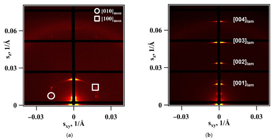 Figure 4a displays GISAXS pattern after long storage at room temperature. The ordered phase was indexed to a columnar monoclinic unit cell (Colmon), which has the following parameters: a = 58.9 Å, b = 50.0 Å, γ = 61°. However, in the LC state with liquid-like side chains which is generated upon cooling from 100 °C, the structure of C8AzoPyr is more sensitive to vapors of polar solvents, such as water or alcohols, due to their more effective diffusion through the amorphous alkyl periphery of the molecular wedges. Thus, swelling in methanol atmosphere for 2 h results in formation of a layer-like lamellar structure with parameter alam = 51.2 Å (Figure 4b). The corresponding indexed 1D-reduced diffractograms are presented in Figure S3.