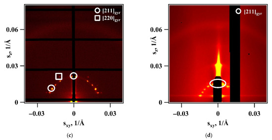 Earlier, we demonstrated that during slow cooling from 100 °C in a methanol atmosphere the high-temperature columnar hexagonal structure transforms to a stable cubic double gyroid structure [35]. It is noteworthy that the normal to the film surface becomes parallel to the 211 reciprocal space direction, as was previously noted for another wedge-shaped mesogen [31]. After several months annealing at ambient conditions, the gyroid structure not only persists but even shows a definite improvement of its organization. POM images of the dry film (not shown here) confirm the absence of birefringence which is typical of cubic phases. The diffraction pattern of C8AzoPyr thin film demonstrates a set of peaks with d-spacings ratio of , which is characteristic of the Cubgyr phase (symmetry ). The corresponding lattice parameter agyr is 117 Å (Figure 4c). The summary of the extinction rules for the different bicontinuous phases can be found in ref. [38].
