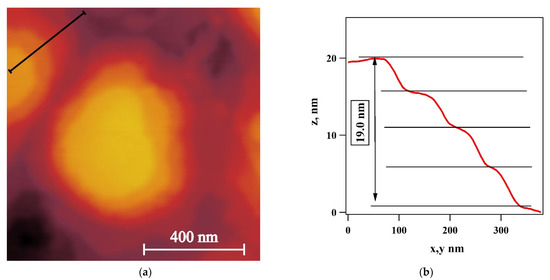 AFM image of a C8AzoPyr thin film: (a) height trace of the film surface at RH = 42%; (b) height cross-section traced along the black solid line in (a) showing quantized terraces.