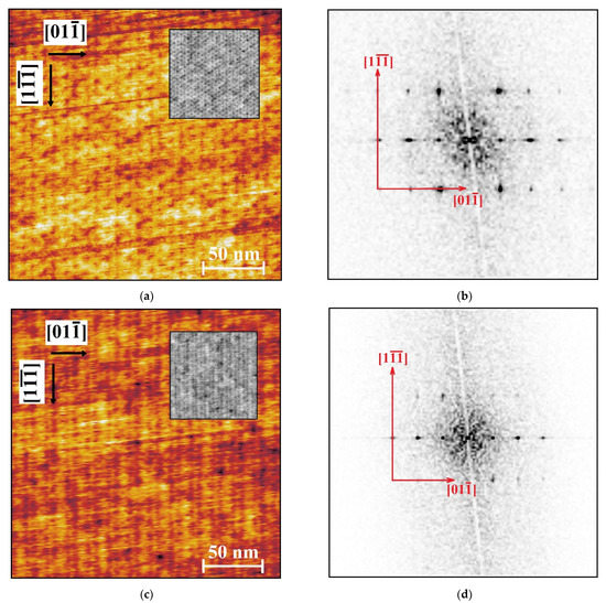 However, if one wants to analyze the gyroid structure with more scrutiny, it would be necessary to image the film surface with higher resolution. An example of such measurement is given in Figure 6, where AFM phase images of C8Pyr thin films at different RH values are shown. Despite some noise present in the images (the images after filtering are shown in the insets), one can recognize the unique pattern of the 211 plane of the double gyroid phase (see, e.g., Reference [39]). The observed morphological features of the 211 plane can be viewed relative to the and reciprocal space vectors that direct along and perpendicular to the characteristic “knitting” features of the plane, respectively. The analysis in the Fourier space given in the right column of Figure 6 allows visualizing the characteristic in-plane periodicities. Thus, the image taken in the dry (RH = 20%) state of the film reveals the fundamental periodicity along the direction of 0.057 nm−1, which is equivalent to the distance of 17.5 nm in direct space. The periodicity in the vertical direction of 0.09 nm−1 provides the corresponding direct-space repeat of 11.1 nm. Taking into account the expressions for both distances given in ref. [39], one obtains the lattice parameter of the gyroid phase to be 12.4 and 12.8 nm, respectively. These values agree relatively well with the corresponding SAXS unit cell parameter, which validates such AFM-based analysis. A small difference (of ca. 3%) in the values computed for the horizontal and vertical directions can be accounted for by a small drift of the piezo along the slow scan direction.