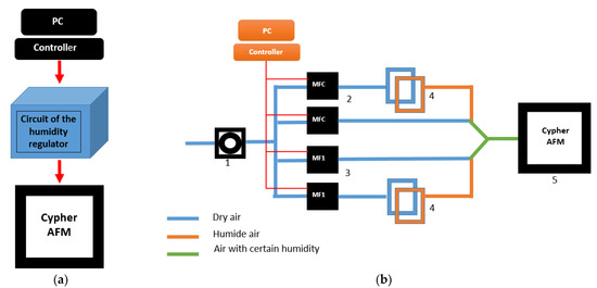 (a): Scheme of portable air humidity control system; (b): aeraulic circuit of the humidity regulator connected to controller and PC: 1–manometer, 2–Mass Flow Controller with flow range of 10,000 sccm, 3–Mass Flow Controller MF-1 with flow range of 100 sccm, 4–laboratory flask with water, 5–Atomic Force Microscope Cypher S Asylum Research.