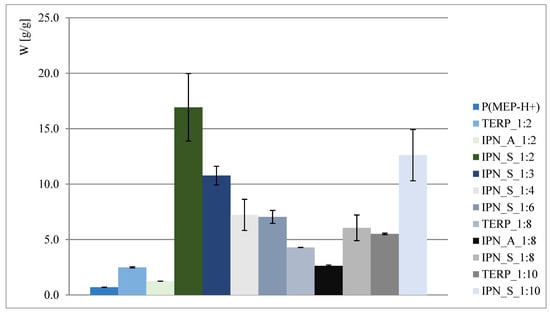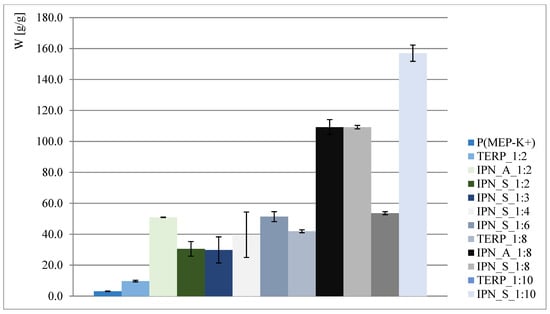 The obtained results are presented in Figure 2 and Figure 3. As shown, interpenetrating polymer networks in the form of potassium salt exhibit much better swelling properties than their compositional analogs—terpolymers. Better swelling of samples with a higher phosphorus content (such as in the case of IPN_S_1:2, where data presented in Figure 2 might suggest that the higher the P content, the better the ability to absorb water) is probably associated with the ionic form of the first component network, so the claim that phosphate groups positively affect swelling properties is therefore untrue. This is also reaffirmed when samples where P(MEP-H+) acts as a first component network are taken into consideration (clearly visible when IPN_S_1:2 and IPN_A_1:2, Figure 2, are taken into consideration). However, the initial crosslinking degree, which is directly associated with BMEP content, is much higher than in most of the commercial hydrogels, yet the materials continue to exhibit very good swelling properties. This is significant, since a higher crosslinking degree influences the mechanical properties of hydrogels (further information in Section 3.5).