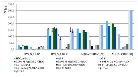 The water regain of selected samples under different pH and ionic strength conditions is presented in Figure 4. The obtained results were also compared with the behavior of some of the most popular agricultural hydrogels—AQUATERRA® and AQUASORB® (SNF Korona JV, Warsaw, Poland) [31]. Similarly to hydrogels reported previously [28], several factors affect IPN behavior, i.e., ionic strength and the type of metal present (valence, affinity to carboxyl/phosphate groups), pH and crosslinking degree/amount of phosphates within the polymer. As can be observed in Figure 4, the material presented here—IPN_S_1:10—exhibits very satisfactory properties when compared to commercial hydrogels, however, it does not possess acrylamide within its structure, which is known for its potentially carcinogenic and toxic properties [32,33,34,35]. Thus, IPN_S_1:10 may be considered a good candidate for acrylamide-based hydrogel replacement, especially when its dual role (as a water and phosphate reservoir) is taken into account. As can be concluded from the results presented in Figure 4, the water regain decrement is not as drastic here as in the case of previously reported materials (especially the ones with very low phosphate content). The increase in swelling at pH = 7.0 and 7.8, contrary to the behavior of commercial hydrogels, is not observed since all of the acidic units were converted into the potassium salt form.