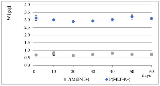 The hydrolytic stability of P(MEP-H+) and P(MEP-K+) was also investigated (pH and water regain control over time).