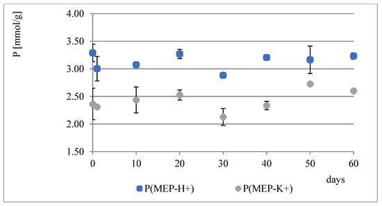 During the course of our previous studies [28], it was observed that hydrogels composed of AAc, MEP and/or BMEP exhibit the ability to release phosphates, which manifests in a pH decrease and, simultaneously, an increase in swelling (as a result of a lower crosslinking degree). This phenomenon may be of great use, since the hydrogels could be applied in agriculture not only as water reservoirs, but also as an additional source of phosphorus. However, the amount of phosphorus within polymers was very small. Therefore, one of the main objectives for conducting these studies was to prepare materials with relatively higher phosphate content without losing their ability to absorb water, which seemed to be impossible to overcome in the course of free radical copolymerization of AAc, MEP and/or BMEP. From Figure 5, Figure 6, Figure 7 and Figure 8, several findings arise, e.g., the first component network, PMEP, regardless of ionic form, does not seem to hydrolyze in water. The slight change in pH above the polymer is observed in the early stages of swelling (1st day—pH = 2.62, 10th day—pH = 2.51). Additional confirmation is provided by the analysis of phosphorus content within the sample, determined using a methodology described in Section 2.3.3 (Figure 5). Such behavior does not resemble that of the second component network (H_AB_2.0, Figure 8, data from [28]). The prepared IPNs exhibit properties which may be considered intermediate ones, e.g., pH changes are observed (the increase in pH is probably the effect of the salt form of the first component network), however, the swelling properties do not improve over time or at least not as effectively as in the case of previously described SAPs (Figure 7). It has been shown previously that significant changes are easily observable only in the case of slightly crosslinked samples, which is also confirmed here. However, once pH decrease was no longer observed, the phosphorus content in solution above IPN gels was determined: 8.0 mol% of phosphorus was released from IPN_S_1:2, whereas from IPN_S_1:10, it was 90.9 mol% (based on average phosphorus content within hydrogels), which explicitly confirmed that IPNs can be applied in agriculture as a source of phosphates. Research on how they actually affect crops is now in progress.