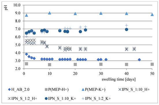 The hydrolytic stability of IPNs was examined by immersing 0.1 g of IPN sample in 150 mL of distilled water and measuring the pH with the CPC-551 Microcomputer pH and Conductivity Meter (Alchem, Wroclaw, Poland). Simultaneously, the weight of swollen sample over time was controlled with an accuracy of 0.0001 g. After changes in pH were no longer observed, the phosphorus content in solution was determined using the method described in Section 2.3.3 (without sample digestion).